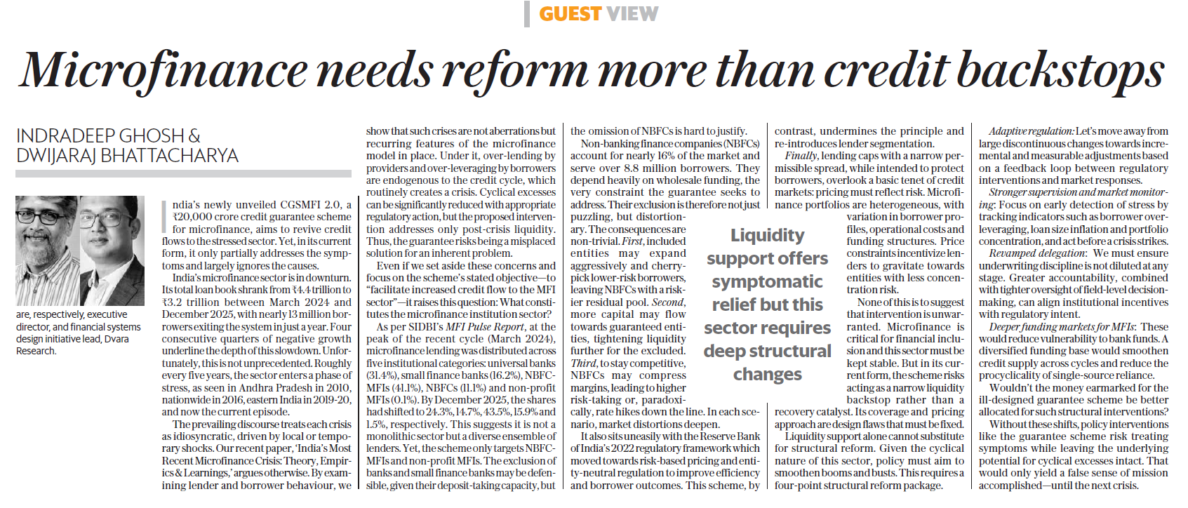 Liquidity support by the Centre may offer symptomatic relief, but India’s microfinance sector needs a structural recast. Without reforms to address recurring cycles of over-lending and loan stress, another credit guarantee package will only postpone the next crisis in this fragile sector.