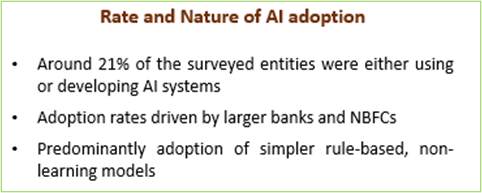1) Adoption rates: Around 21% of the surveyed entities were using or developing AI systems. These numbers are driven mainly by large public and private sector banks and NBFCs who were adopting simpler rule-based models.