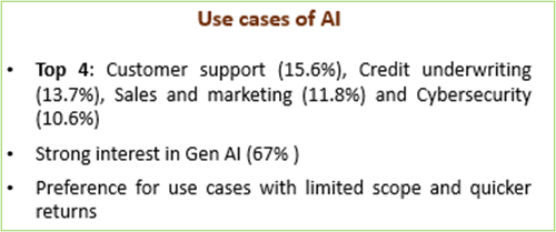2) Use cases:AI was primarily used for (a) customer support (15.6%), (b) credit underwriting (13.7%), (c) sales and marketing (11.8%) and (d) cybersecurity (10.6%). There was strong interest in Generative AI, with majority of entities experimenting with small-scale pilots, often internal chatbots. Most smaller entities preferred use cases with quick-return, wary of AI’s rapid sophistication and cost of obsolescence.