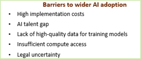 3) Barriers and risks in AI adoption: Several barriers in wider adoption of AI were cited, including (a) high implementation costs (especially a constraint for smaller entities), (b) AI talent gap, (c) lack of high-quality data for training models, (d) insufficient compute access and (e) legal uncertainty. Many entities remained cautious about advanced or customer facing AI use cases. They cited risks concerning (a) data privacy, (b) cybersecurity threats, (c) governance challenges arising from the opacity and unpredictability of technology and (d) reputational loss.