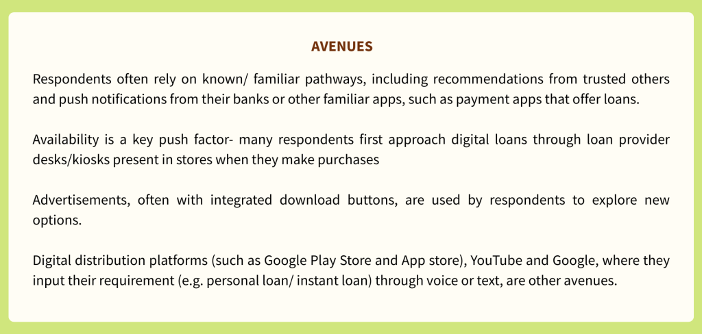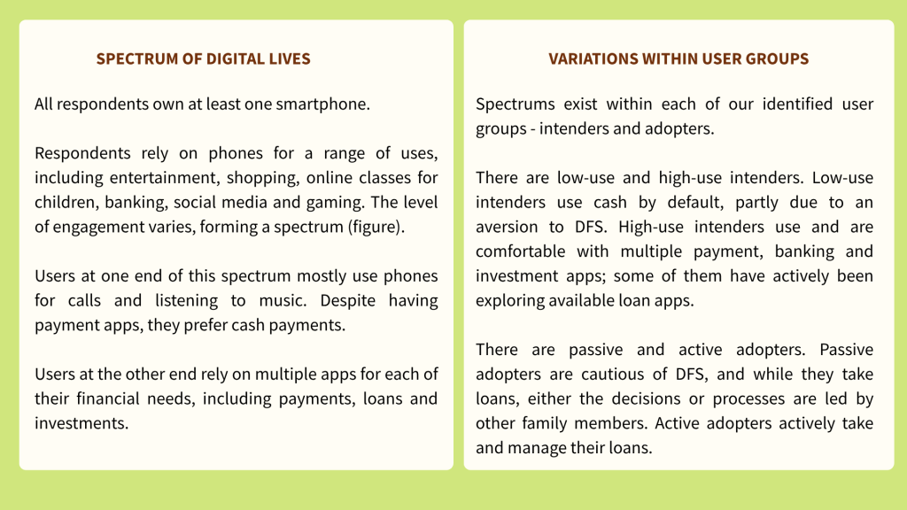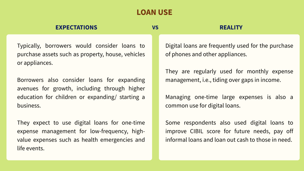 | What? | Respondents were asked about their mobile usage, how they handled finances, their idea of trust across several domains and their perceptions of and engagements with different loan sources, followed by a stimulus to gauge how they perceived sample digital lending apps |