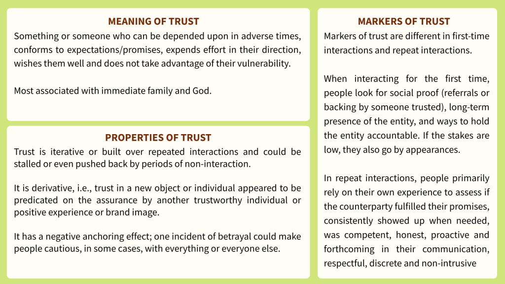 In our previous blog, we discussed how the intent to trust being implicated in the act of trusting makes it difficult to define trust. Instead, a more feasible approach would be to study the factors that a potential customer (for adoption) or an existing customer (for continued usage) can base their expectations of DFS on or in other words, the proximate grounds to trust DFS. In this blog, we attempt to identify some of these proximate grounds of trust.